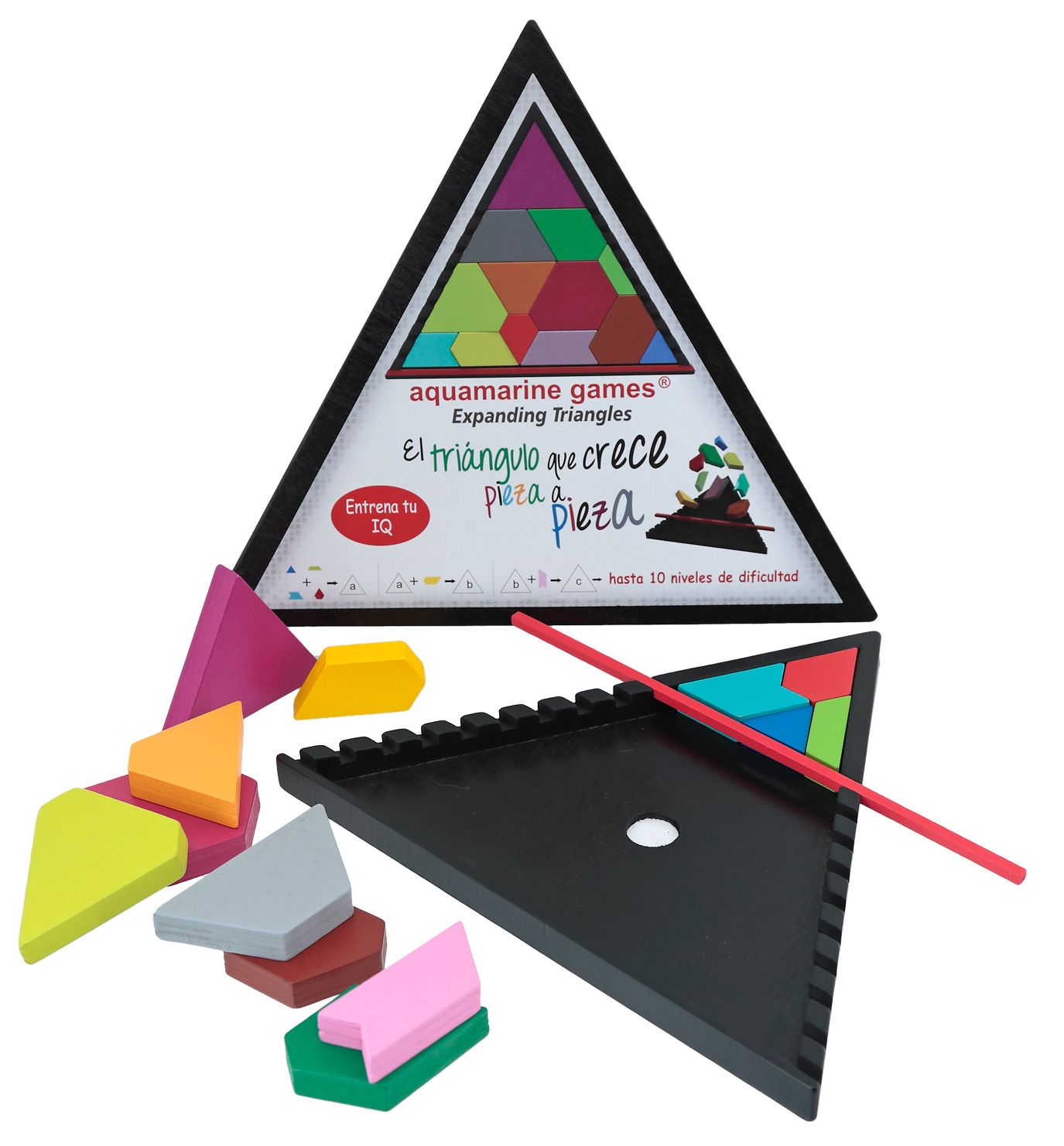 10 RETOS EN 1. Entretenido puzzle de piezas grandes en forma de triángulo. Segun el numero de piezas que elijamos, podemos hacer 10 triangulos de diferente tamaño consiguiendo 10 niveles de juego.